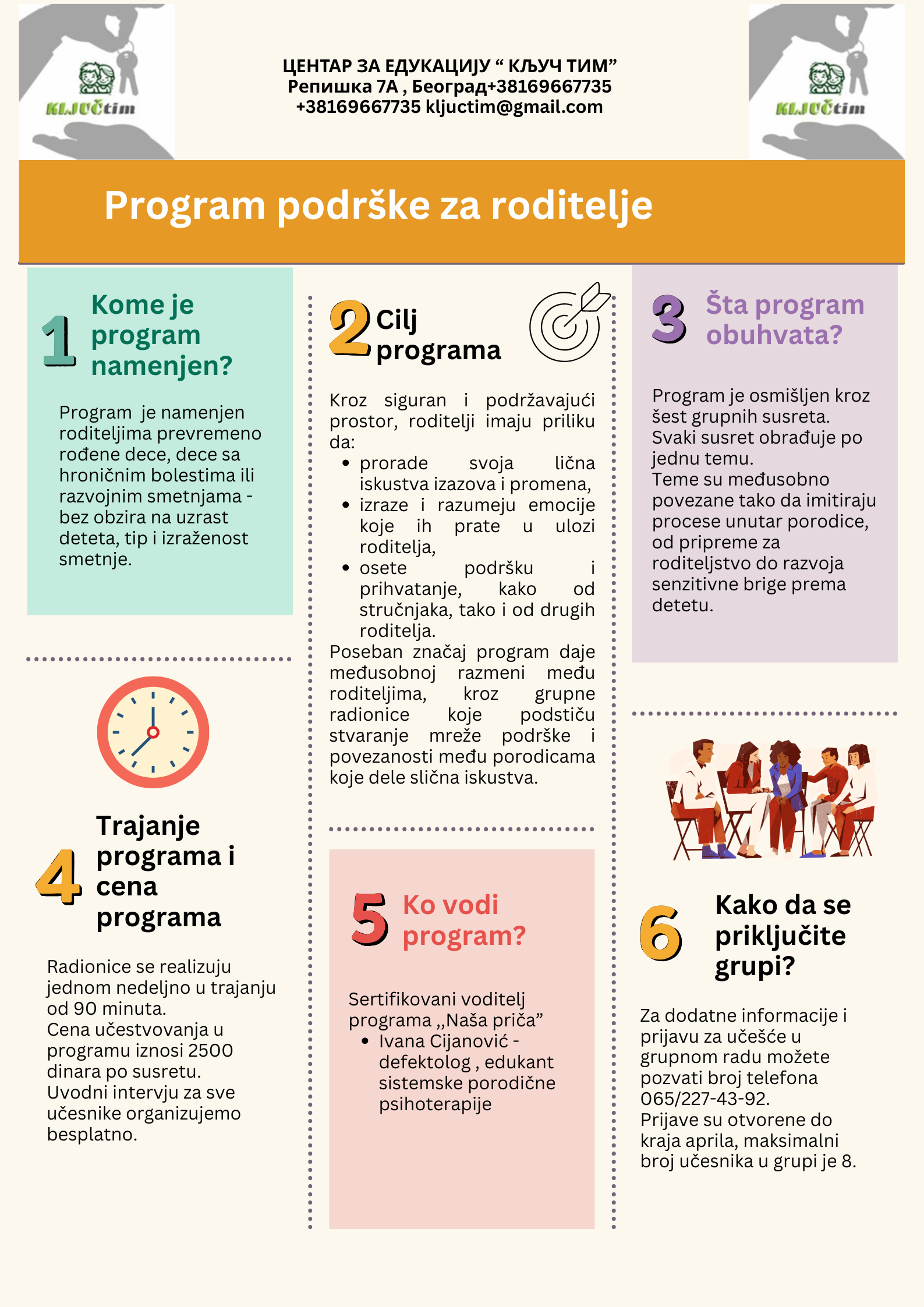 Grupni susreti se organizuju jednom nedeljno u trajanju od po 90 minuta. Cena